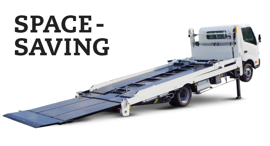 油圧ジャッキ(アウトリガー)でキャビン後部を持ち上げて荷台を傾斜させる従来のタイプを踏襲し狭い場所、混雑する道路など場所を選ばない省スペースタイプです。